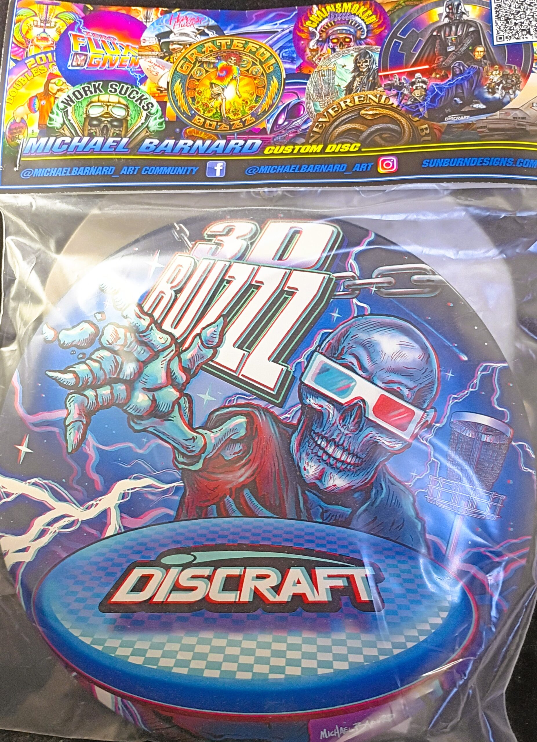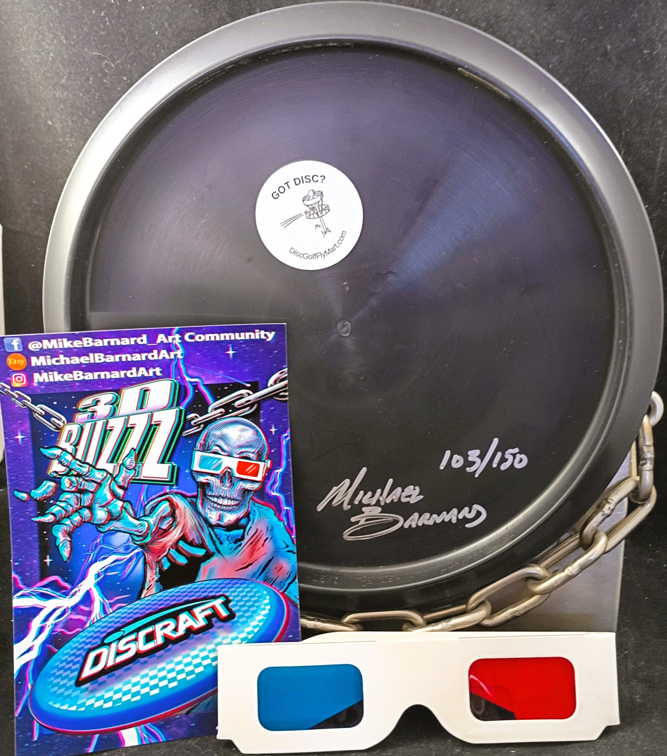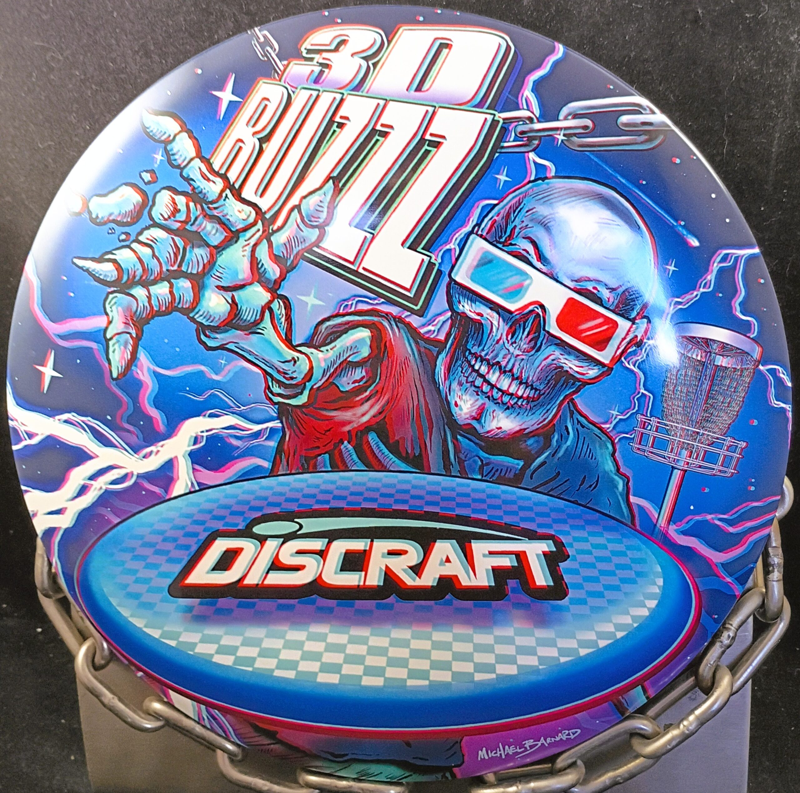 This is a Brand New Discraft Michael Barnard Full Color 3D ESP BUZZZ Mid Range Golf Disc 177+ grams in unthrown condition. Number 103 of only 150 made. Artist Michael Barnard’s captures a Buzzz flying to you in 3D. It’s sealed in a bag, comes with a certificate of authenticity, 3D glasses and is autographed by MB on the back.