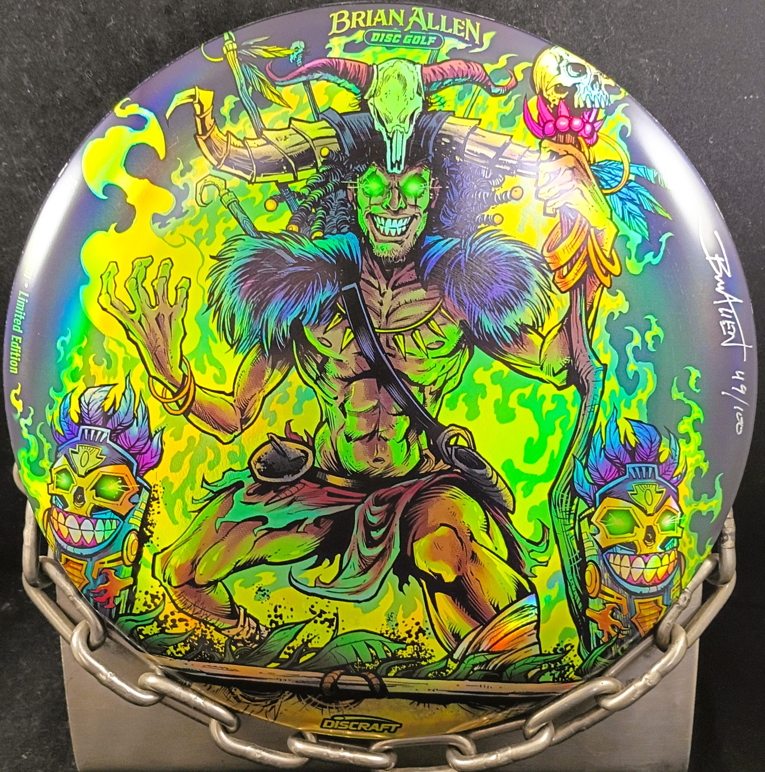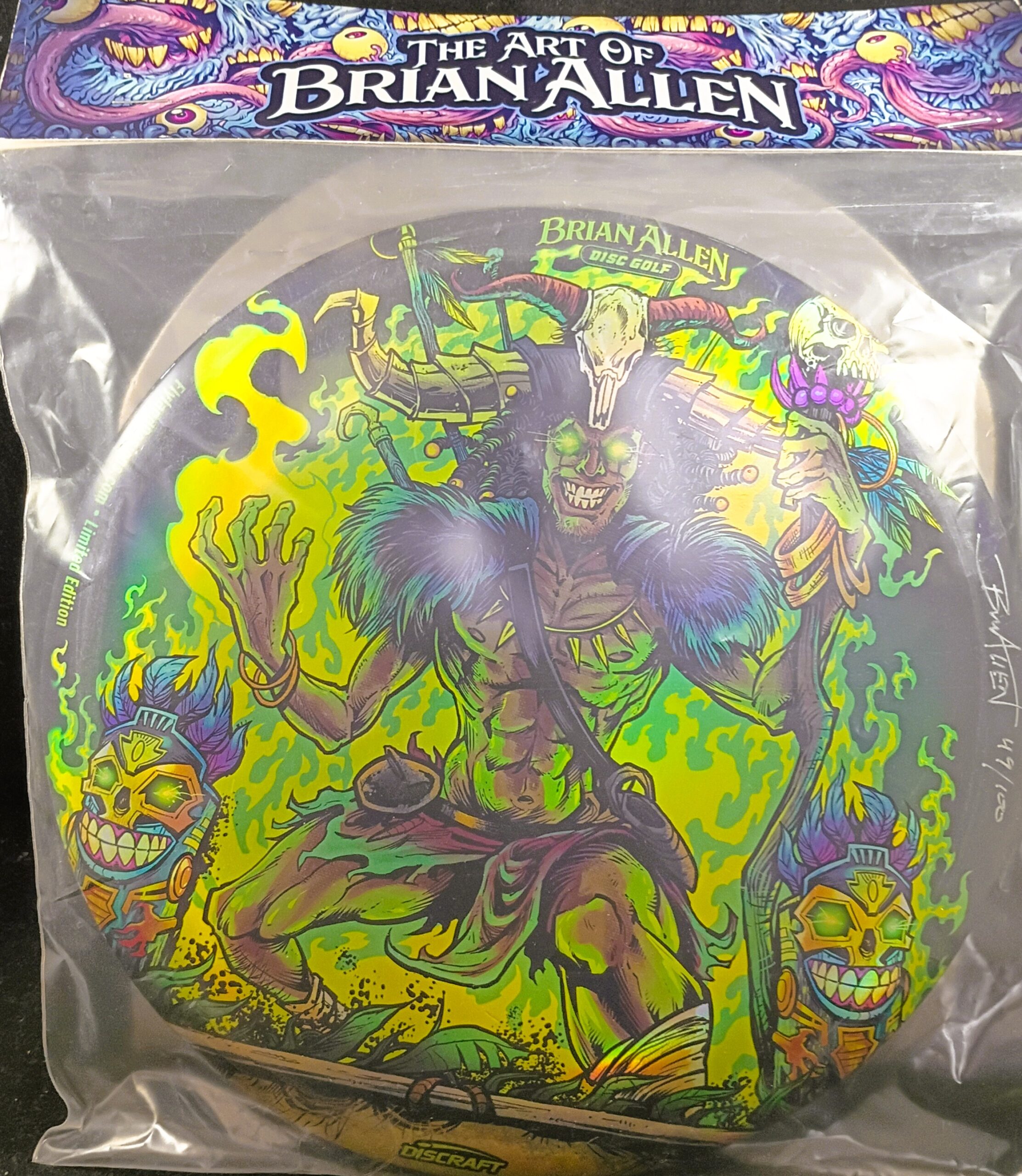 This is a Brand New Discraft Foil BUZZZ Disc Golf Full Foil Witch Doctor BUZZZ Mid Range Driver 173-4 grams in unthrown condition. Artwork by Brian Allen this is #49 of 100 produced. You get the disc in the picture.