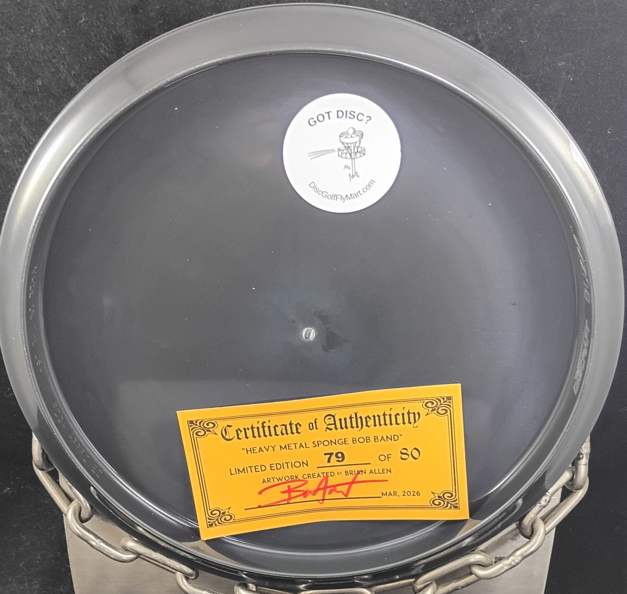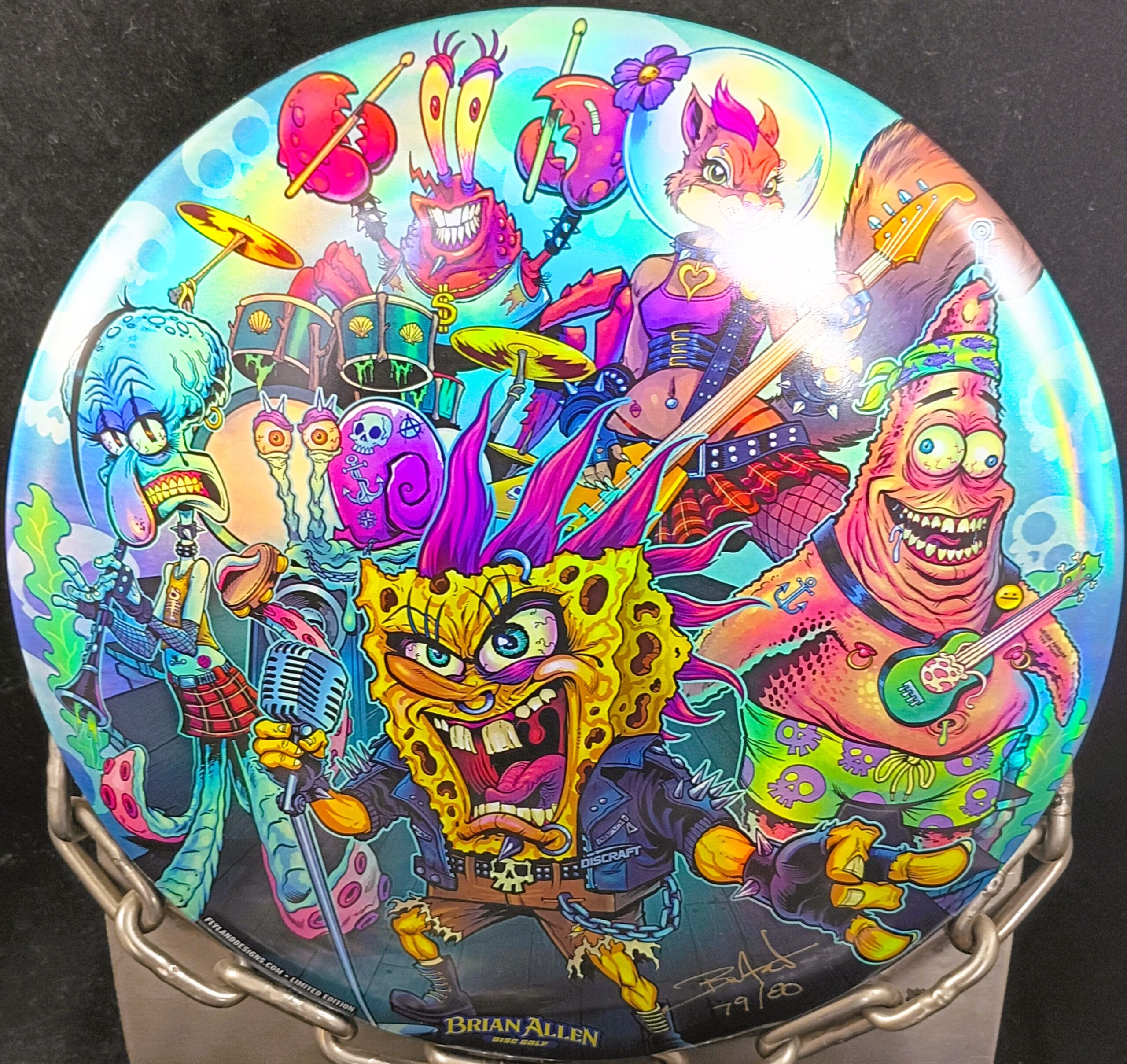 This is a Brand New Discraft Heavy Metal Sponge Bob Band Full Foil ESP BUZZZ Mid Range Golf Disc 177+ grams in unthrown condition. Artist Brian Allen had only 80 of these made, this one is #79. It’s sealed in a bag as pictured. You get the disc in the picture.