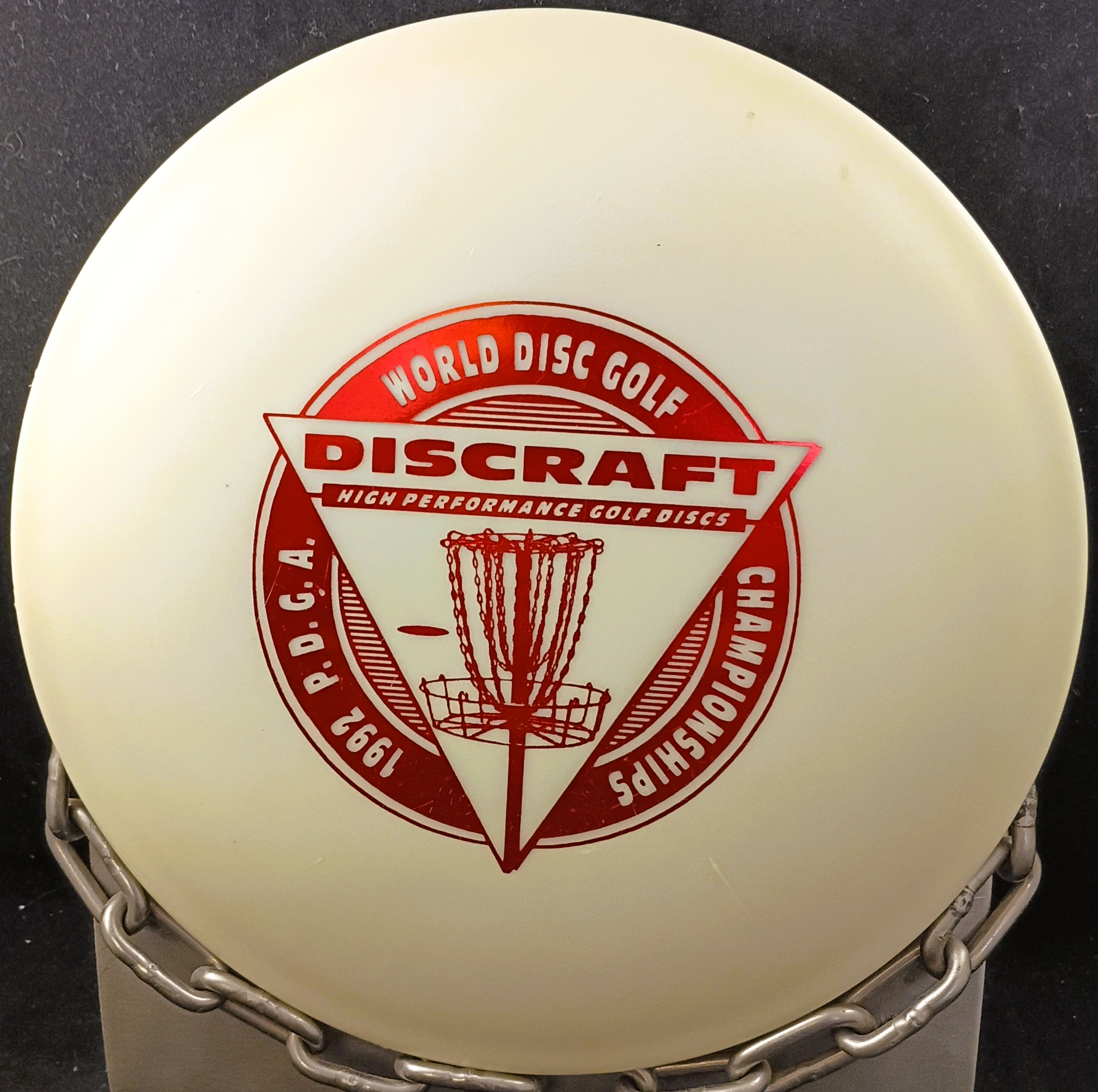 DISCRAFT Says: Nothing! This disc was made in the ’90s and is a beveled edge early distance driver but would qualify as a mid range by todays standards. It’s from the 1992 PDGA World Disc Gold Championships. This one is fresh and has aged nicely. See Discrafts Plastic Guide HERE