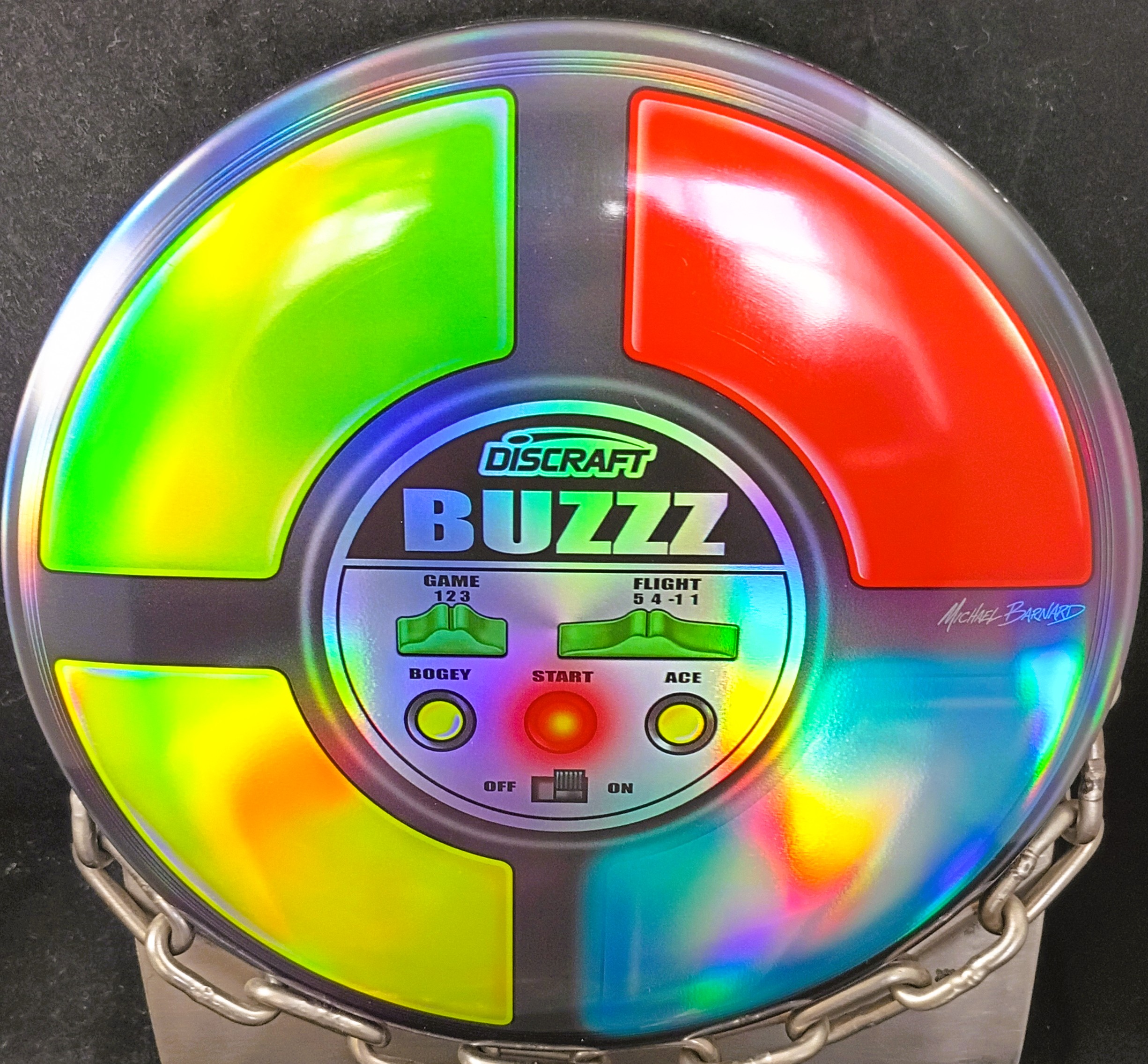 This is a Brand New Discraft Michael Barnard Full Foil ‘Simon Says’ BUZZZ Mid Range Disc Golf Driver 170-2 grams in unthrown condition. Number 19 of only 125 made. Artist Michael Barnard’s Simon Says parodies this early video game. It’s sealed in a bag and is autographed by MB on the back.