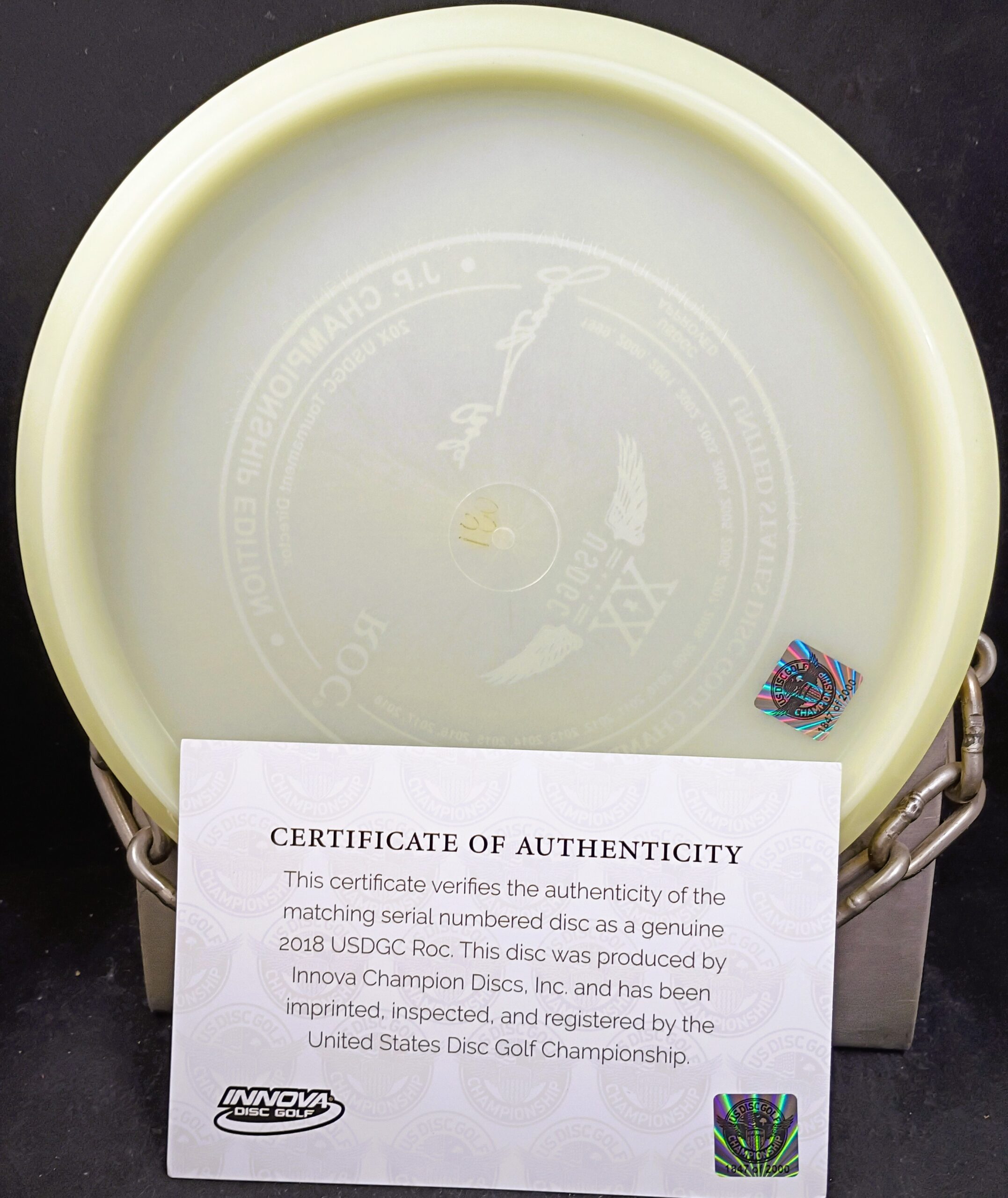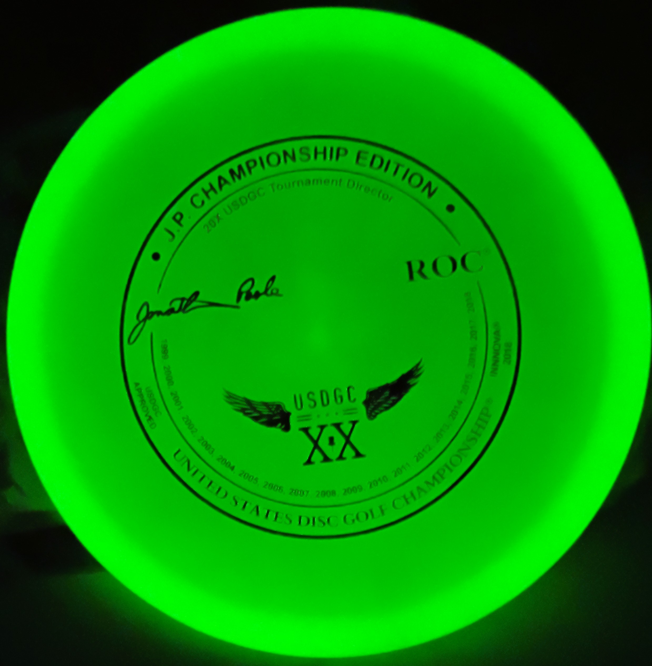 This is a Brand New Innova 2018 Johnathan Poole 20 Years Tournament Director of the United States Disc Golf Championship Glow Champion ROC Mid Range Golf Disc 180 grams in unthrown condition. You get the disc in the picture.
