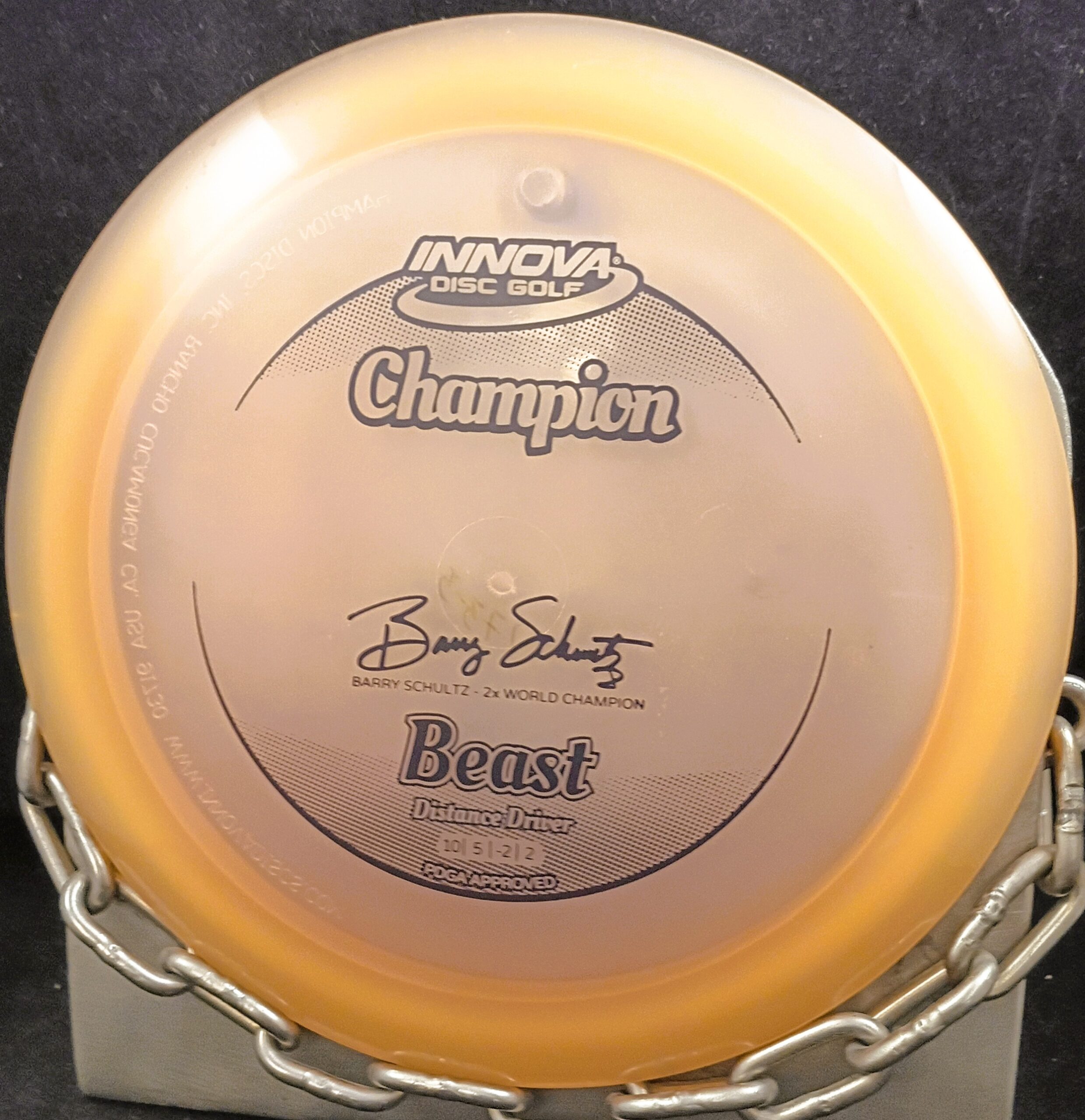This is a Brand New Innova Barry Schultz 2X Champion BEAST Disc Golf Driver 173-5 grams in unthrown condition. The disc in the picture is the disc you get.