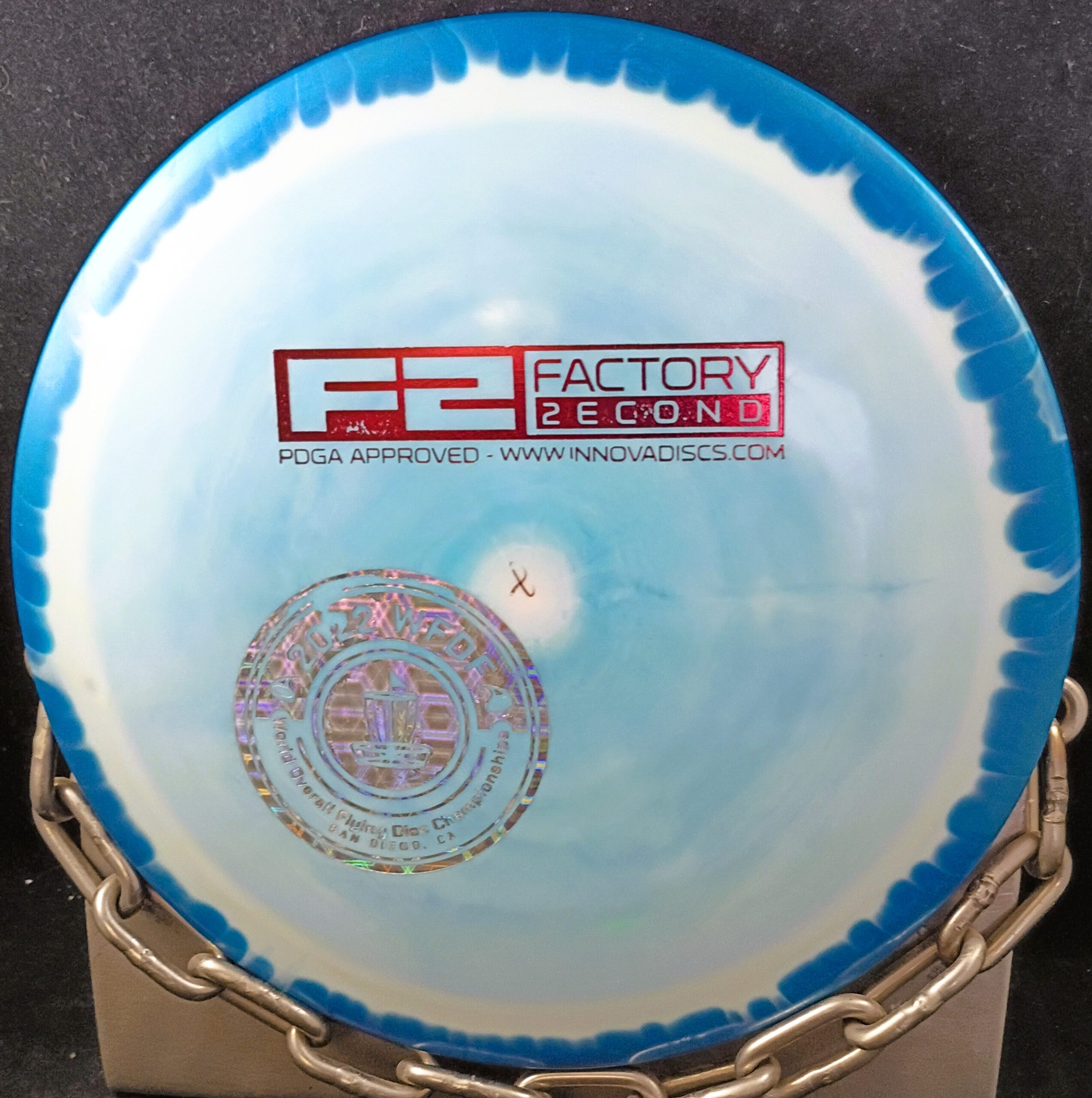 Disc-Blue — Stamp-Red/Silver Prism WFDF World Flying Disc Federation
