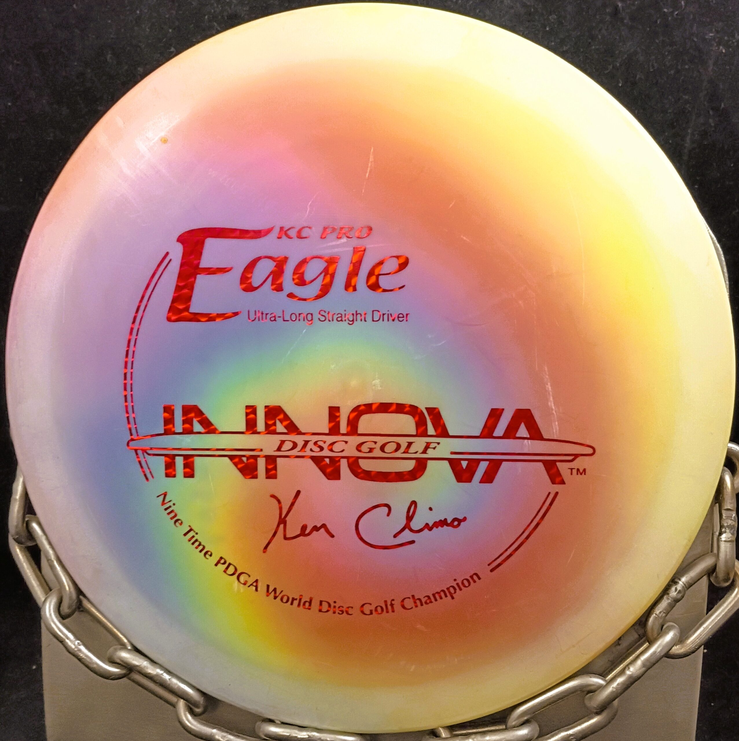 This is a Barely Used Innova Ken Climo 9 Time World Champion Fly Dye KC Pro EAGLE Disc Golf Fairway Driver 174 grams in used condition. The disc in the picture is the disc you get. The unfortunate ink on the back is the main reason it carries a used tag. Although it may have been field tested any air time evidence is minimal to non-existent.